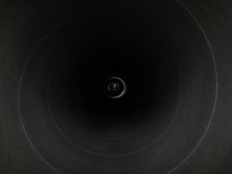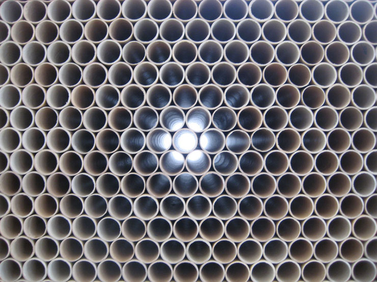 Repeated from her 1st solo biennial EXPERIENCE (2000) in larger scale, tubes hung end-to-end, ~3" apart, at Curtis' eye level. Participants asked to look into end to view circles of light. (10"x10"x2,640")