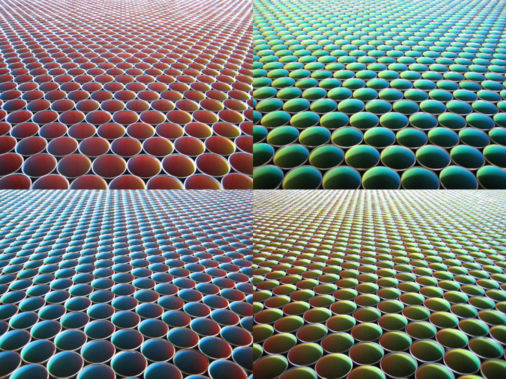 Repeated from her 3rd solo biennial CHANGE (2006) in larger scale, audience walked around installation as its perceived hue collectively changed from red to orange to yellow to green to blue to violet to red... (4.5"x252"x252")