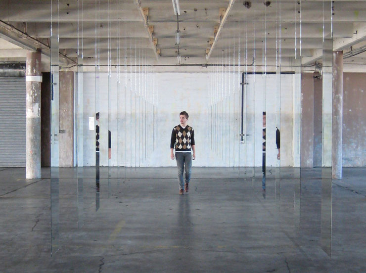 Participants asked to walk slowly between two rows of mirrors where they observed their undulating infinite reflections. (78"x60"x756"; each mirror 12"x48")