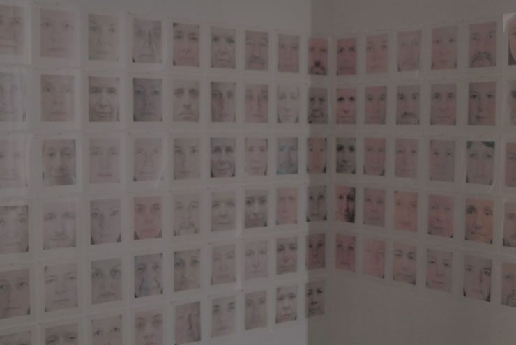 Over course of year, Curtis photographed faces of 99 people in her life, including herself, outputting each face on overlay. Two overhead projectors created large projected diptych on wall. Mounted on other wall was grid of all 99 overlays. Curtis choose 9 overlays from wall placing on right projector, creating new face. Each participant asked to remove overlays from this projector and chose 9 new overlays to place. On left projector was single overlay with image Curtis generated in Photoshop--collective, merged face of all 99 people. (each overlay: 8.5"x11")